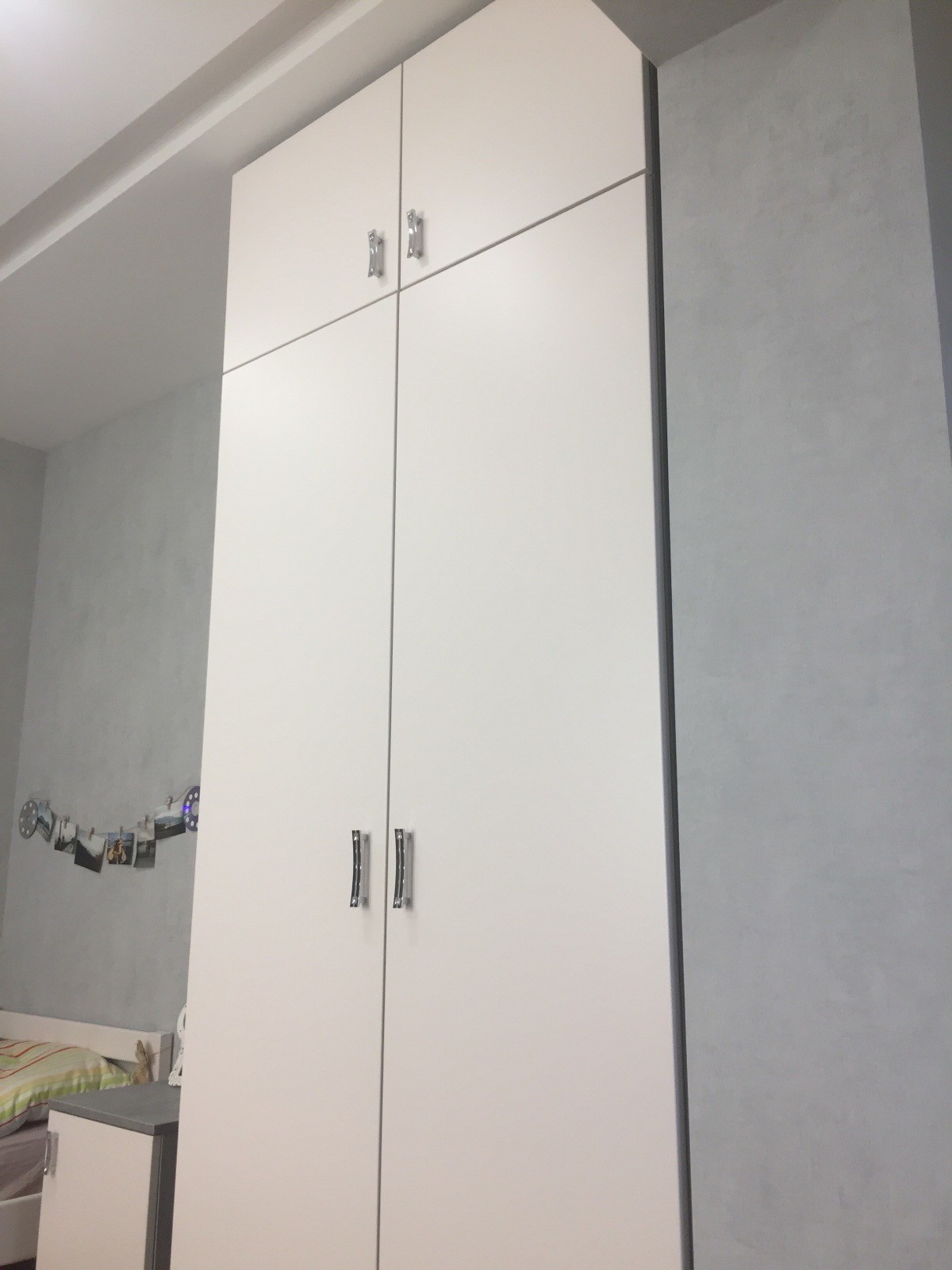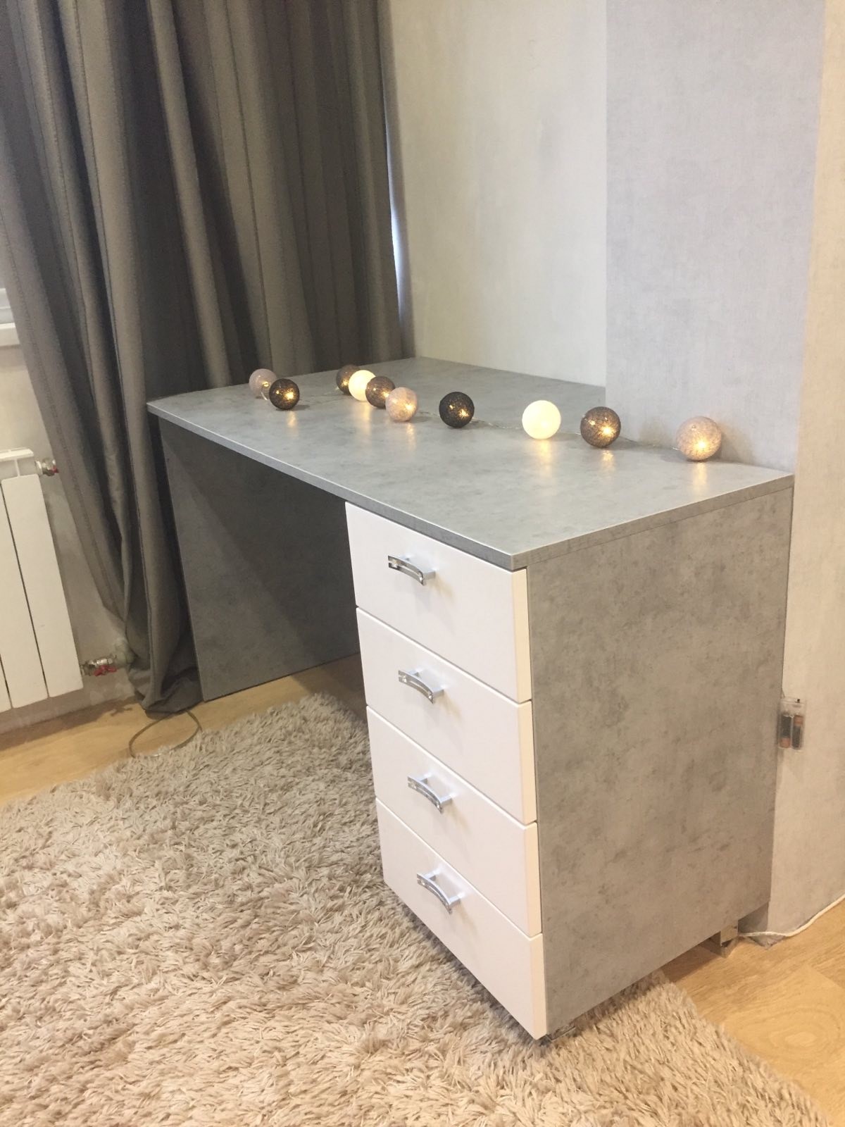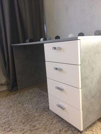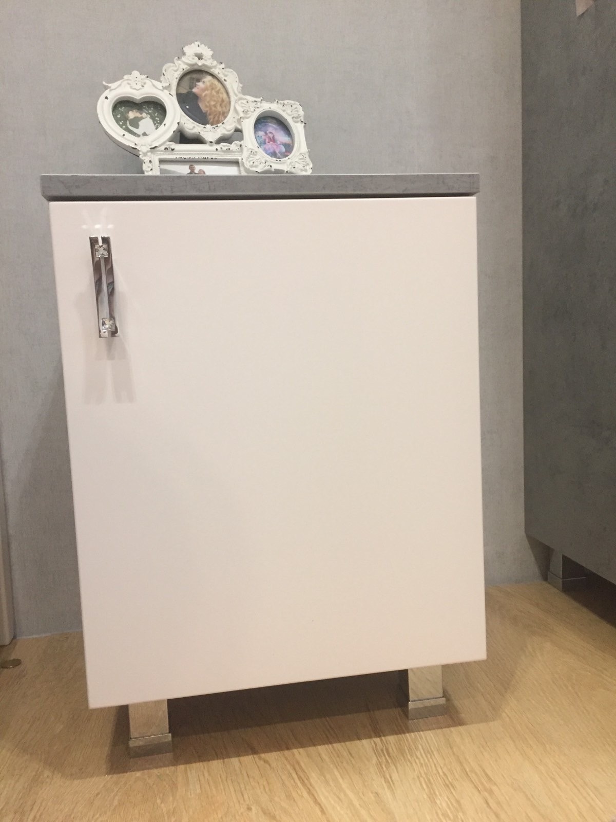 Фасади виконані в ніжному, рожевому кольорі, який стильно поєднується з ДСП (сірий бетон Егер). Направляючі та петлі від марки Блюм.