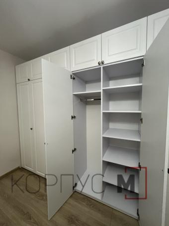 Модульна шафа “Мадрид”. Корпус ДСП біле товщиною 18мм - фасад МДФ білий фарбований. Наявність антресолей збільшує висоту шаф, довершуючи композицію.