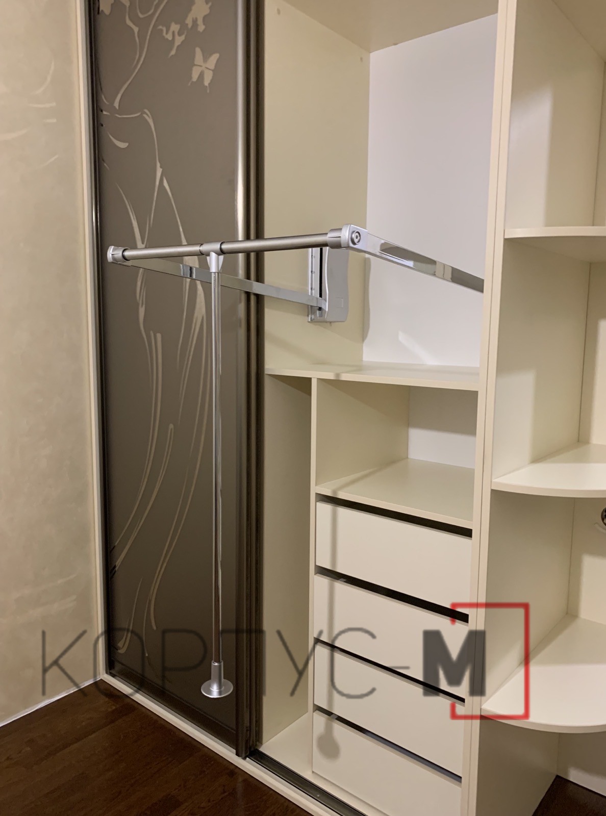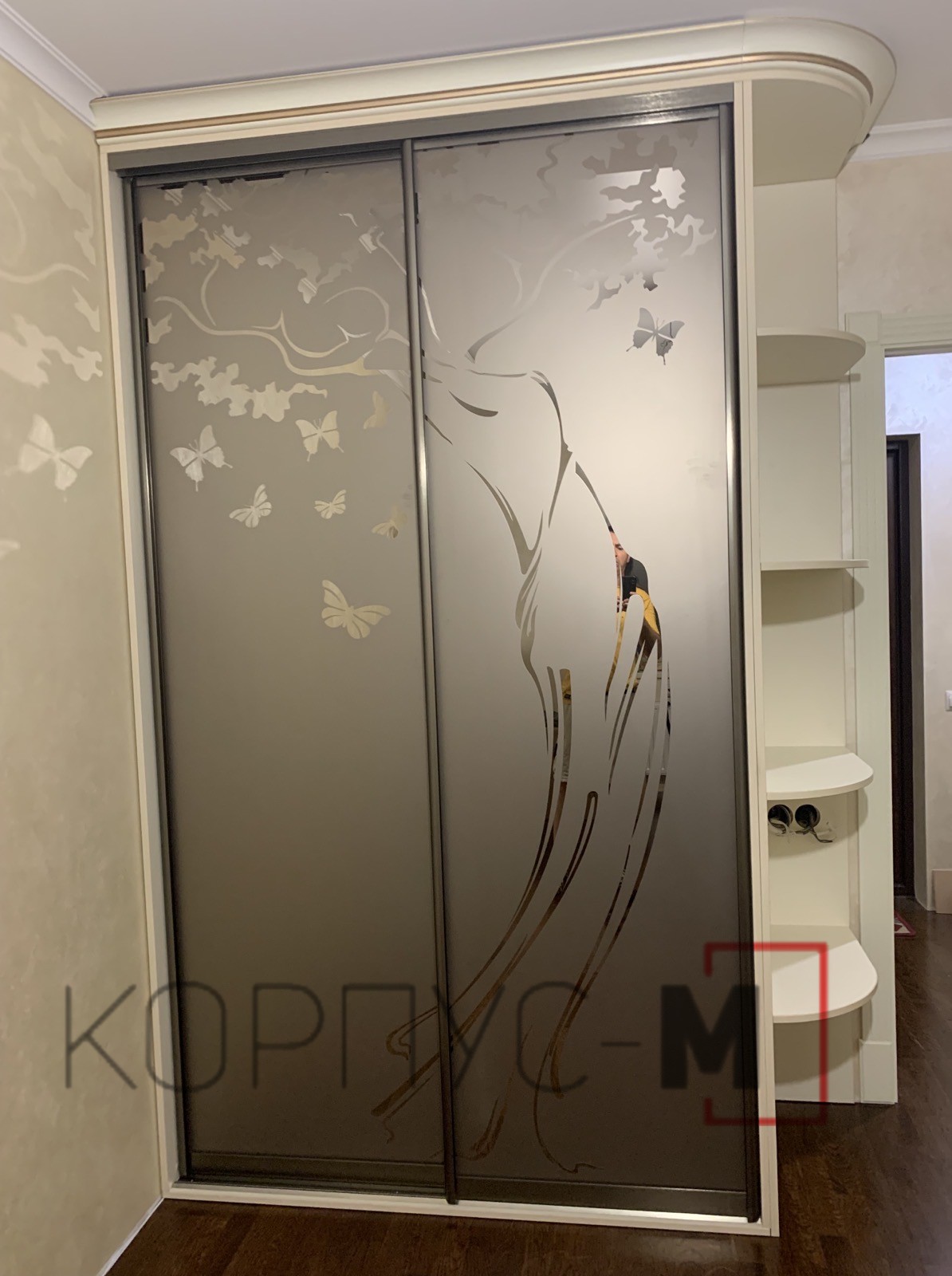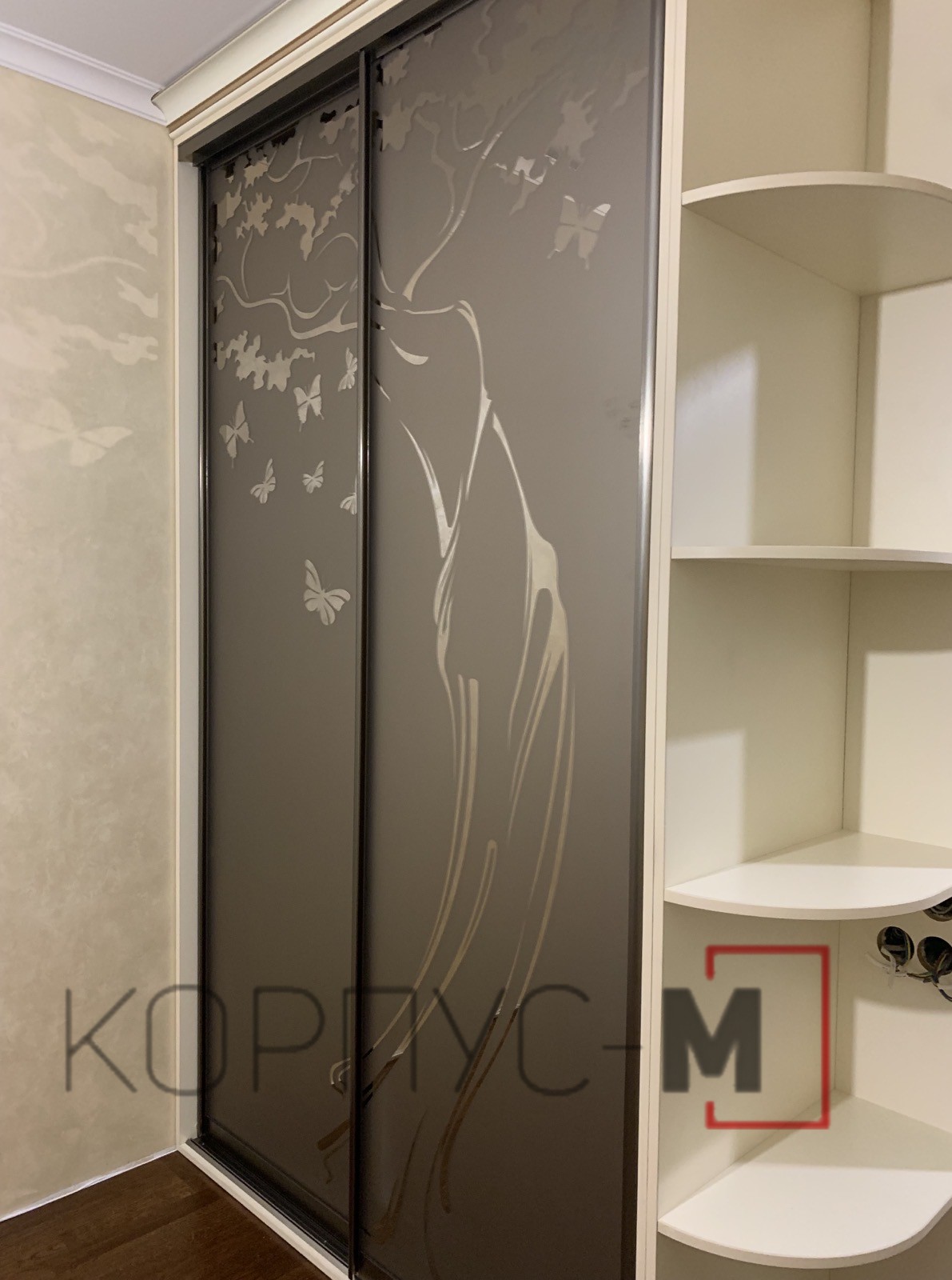 Дозвольте презентувати наш невеличкий проект – шафу-купе на замовлення. Використано систему АДС-браш, бронза світла. Дверне наповнення - дзеркало бронза з художнім матуванням. Корпус шафи - ДСП Еггер 18 мм, слонова кістка. Для зручності оснащений партографом та декоративним куточком.