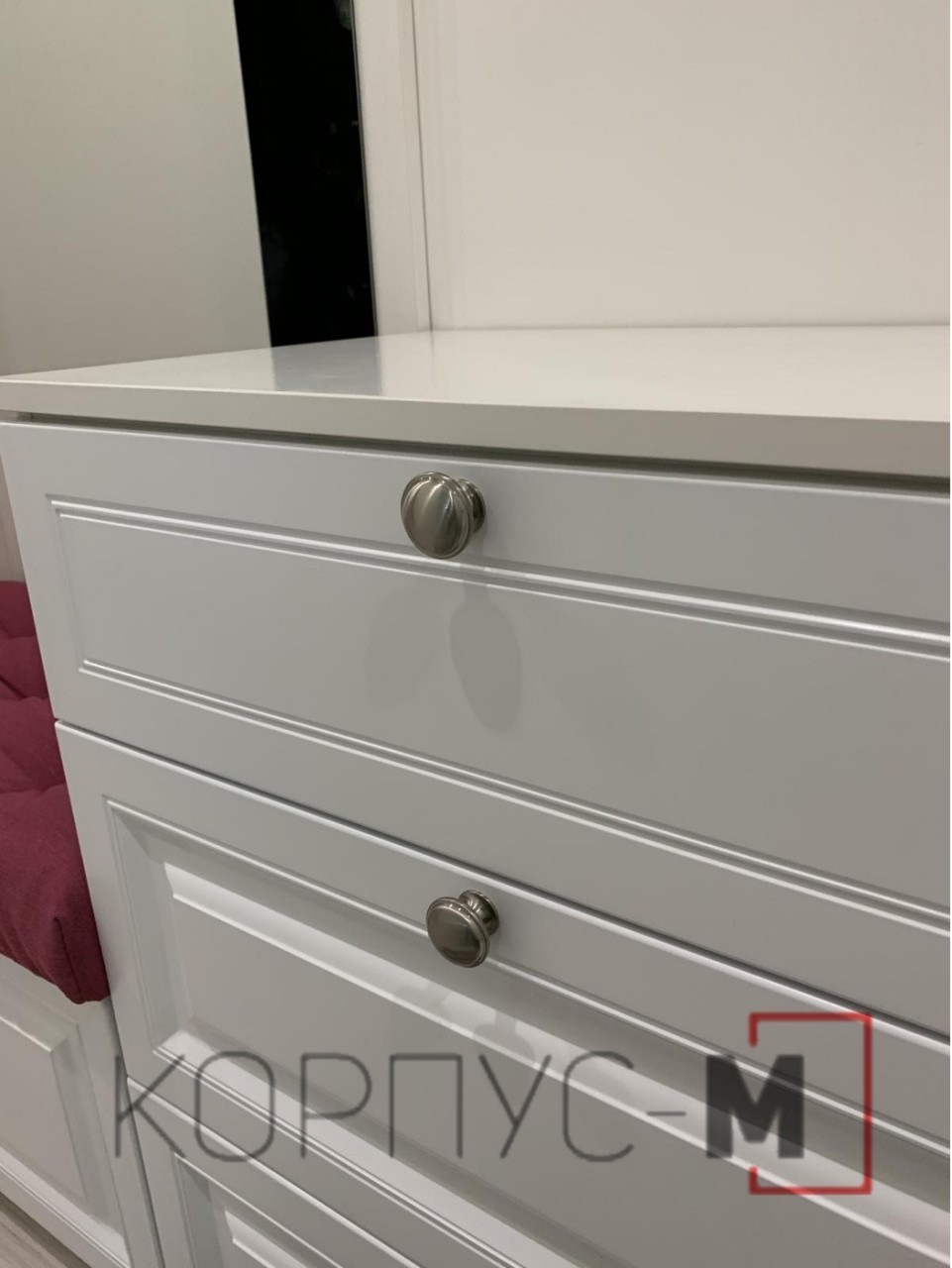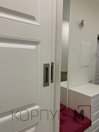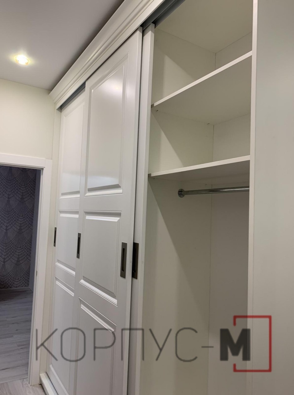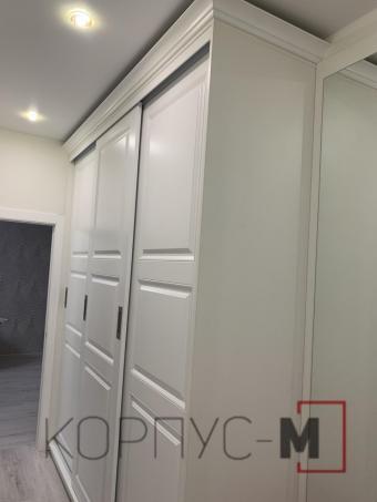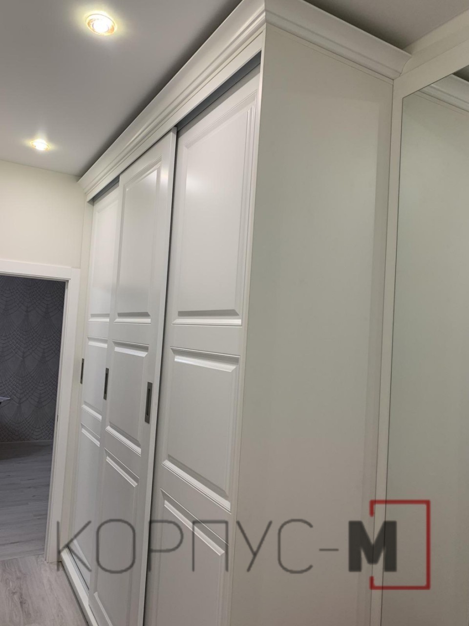 Стильний та сучасний меблевий гарнітур в передпокій. Фасадна частина фарбована, фрезерування «Мелані». Матовий білий колір створює ефект затишної ніжності, хоча шафа дуже вмістка та чимала! Вмонтовані ручки не заважають і дають змогу легко переміщувати дверне полотно.